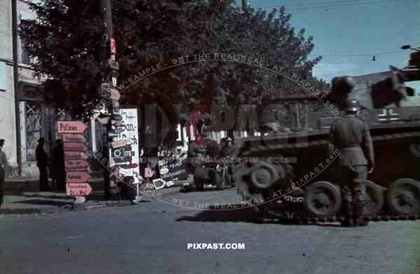German Panzer mark 3 tank road signs motorbike field police Ukraine town 1943. 9th Panzer Division.