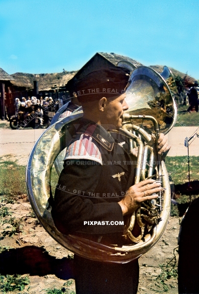 German Panzer tank Music band playing the Tuba for local Russian farmers. 3RD Panzer Division. Russia 1942