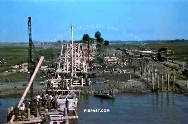 German Pioneer Construction unit building military bridge over the river Dnepr in Krementschuk, Ukraine 1942
