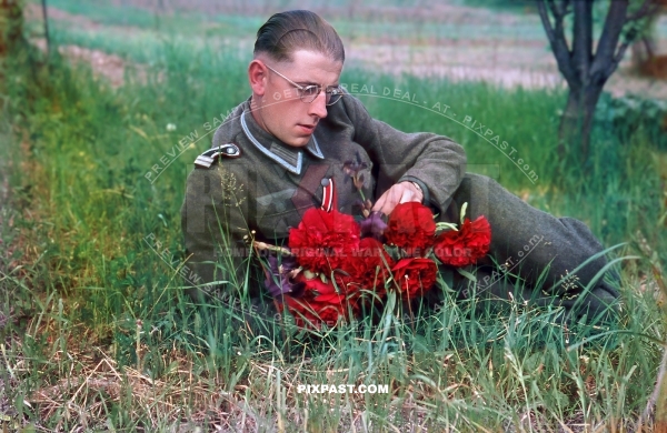 German soldier dreaming in field with handful of beautiful flowers. Russian front 1943. Iron cross Ribbon
