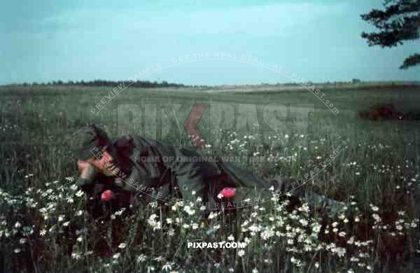 German soldier in flower field in Smolensk Russia 1942 summer. hitler moustache with glasses and hat.