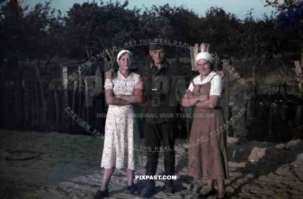 German soldier with local village women, 10th Motorised infantry division repair werkstatt Bryansk 1941, binoculars,