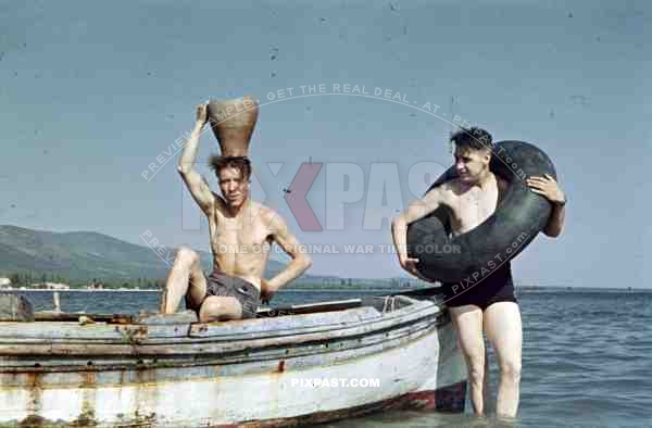 German soldiers infantry shorts swimming play joke funny pot boat beach sea Greece 1942