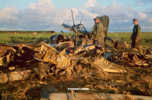 German soldiers inspecting a badly damaged crashed Luftwaffe air force Stuka dive bomber plane. France 1940
