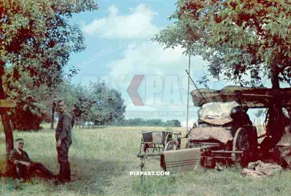 German soldiers resting beside horse drawn wagon in French orchard 1940