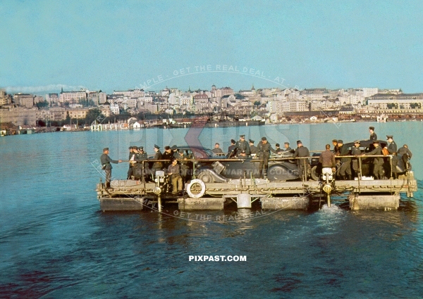 German staff cars and army personnel transported on army ferry across lake in Belgium 1940.