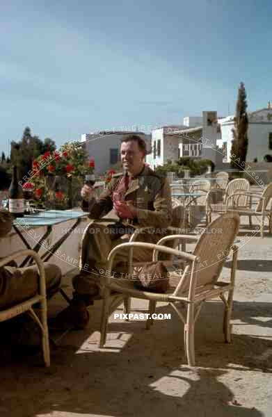 German War Photographer Fritz Moosmüller drinks wine beside Leica III Camera, Apartment Balcony, Karthago, Tunesien 1942