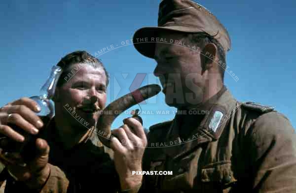 German War Photographer Fritz Moosmueller eats german sausage in Tunisia 1942. 90th Light Infantry Division.