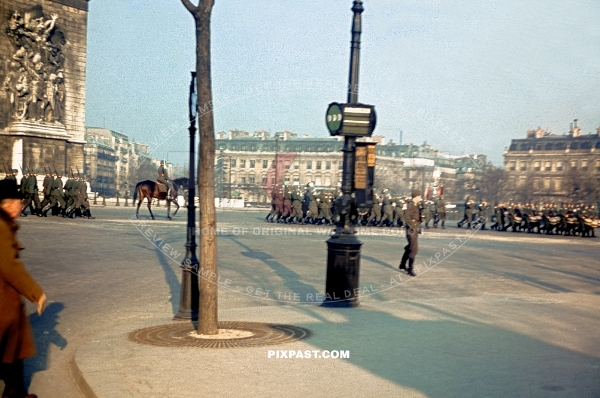 German Wehrmacht army music band marching in parade through Paris France. Arc de Triomphe. France 1940