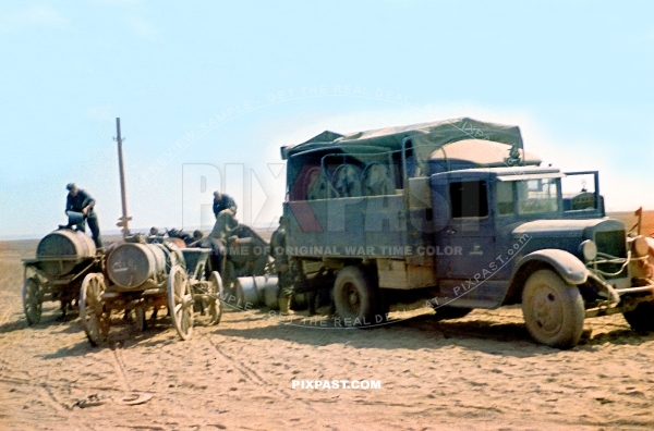 German Wehrmacht army truck with petrol tanks and radio Funk wire rolls. Russia 1941. 297 Infantry Division