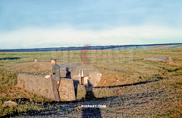 German Wehrmacht Gefreiter inspecting small infantry machine-gun bunker in Netherlands field 1940