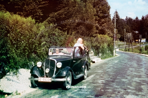 Germany family with black car from Rheinprovinz go on summer holiday 1938. Idar Oberstein. the Felsenkirche.