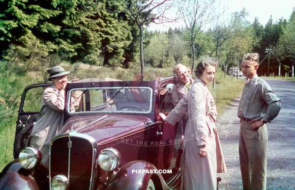 Germany family with red car from Rheinprovinz go on summer holiday 1938. Idar Oberstein. the Felsenkirche.