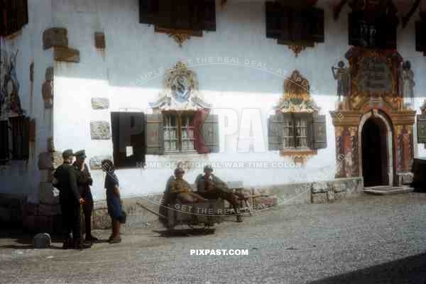 GIs of the 101st Cavalry Regiment in Ruhpolding Bavaria 1945 smoking, standing beside German Wehrmacht officers.