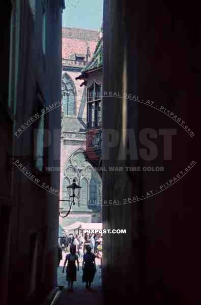 historical store and cathedral in Freiburg im Breisgau, Germany. Shot from the Kaufhausgässle.