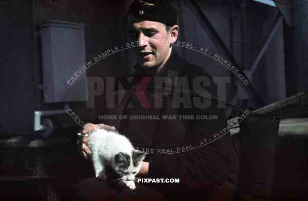 Kriegsmarine seaman with pet cat on a warship at the french Atlantic coast 1941