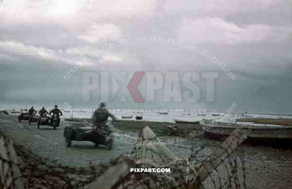La Rochelle, France, Frankreich, 1941, Motorbike Messengers Kradmelder, 22nd Panzer Division. fishing boats, beach.