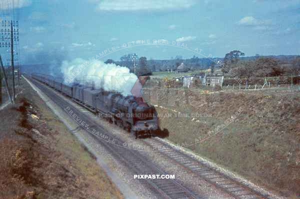 Large German troop transport Locomotive moving soldiers between Halle and Leipzig. Germany 1940