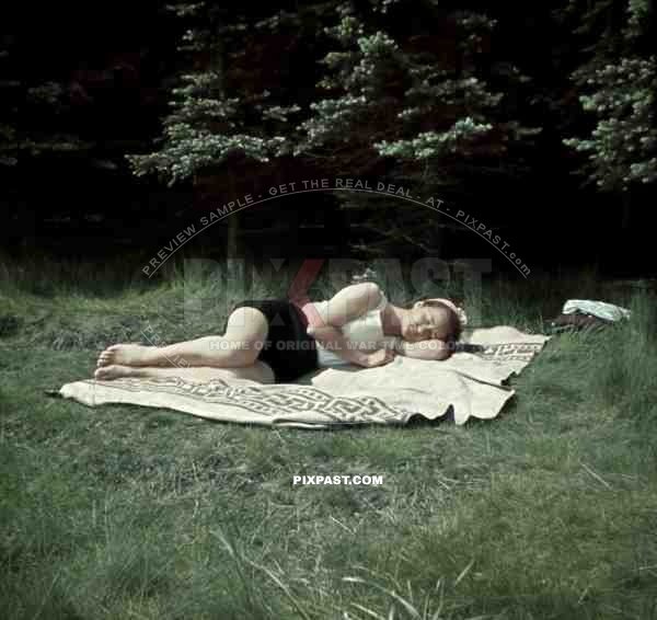Leipzig sleeping lady summer Rosental park blanket Germany 1940 color agfacolor