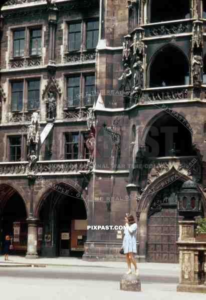 Little bear foot girl playing in front of New Town Hall. Neue Rathaus. Marienplatz. Munich Germany 1947