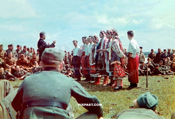 Local East Ukrainian villagers perform music show for Germany arms soldiers. East Ukraine 1942. Local costume
