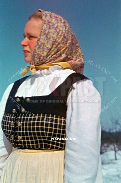Local farmer girl in traditional costume. Bad Reichenhall Germany Winter 1944
