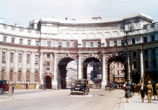 London taxis and British army soldiers in front of Admiralty Arch. The Mall. London England 1944