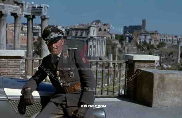Luftwaffe flak officer with Krim Shield of the Leichte Flak Abteilung 99 (mot) in Rome Italy 1944 with staff car.