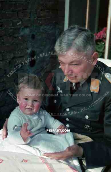 Luftwaffe officer (with iron cross and 1914 Iron Cross 2nd Class with 1939 Spange) with his child in Halle Saale, Germany 1941