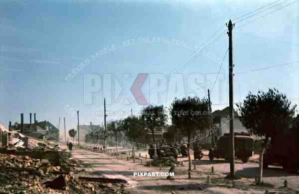 Main street in Ustiluh, Ukraine, Summer 1941, German 94. Infantry Division, Radio Funk Unit, staff car and trucks.