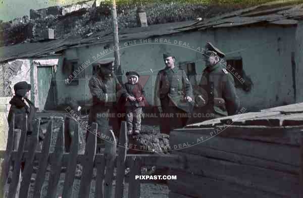 Mariupol Ukraine 1942, German army officers play with local children in farm.