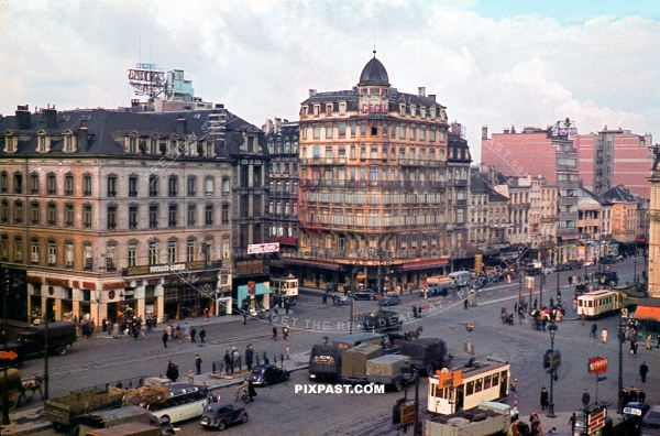Market place in Brussels Belgium 1940. Market filled with buses, trams and trams. Cecil Hotel.