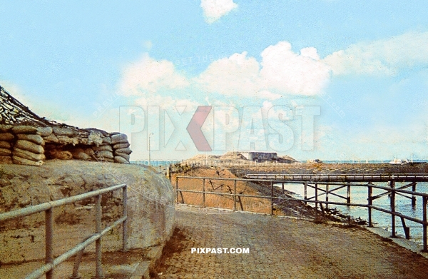 Massive military artillery bunker on the French coast. Colorful camouflage and sand bags and netting. France 1940