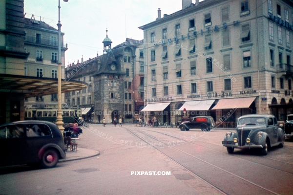 Molard Clock tower in Geneva city center Switzerland 1945. Classic cars. oldtimers. Vans and Hotels.