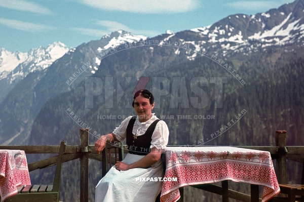 Mother in local Austrian Dirndl costume in Tyrol southern Austria 1939. Mountain restaurant.