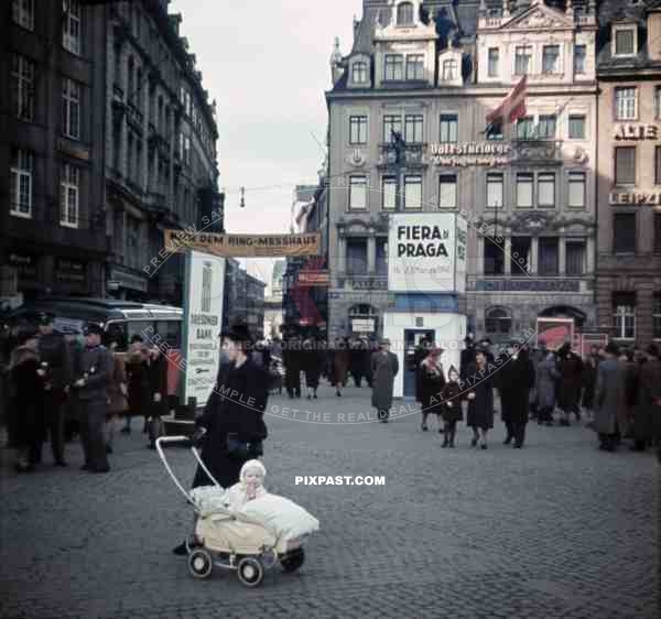 mother with baby in a pram at the market place in Leipzig, Germany 1941