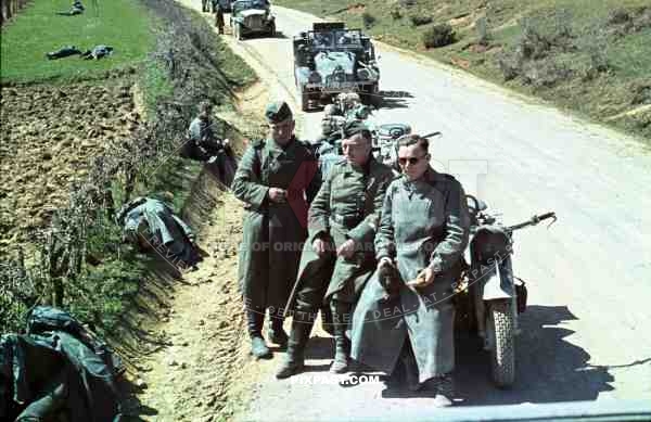 Motorbike messengers rest on dusty road, Russia 1941