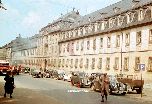 Old cars and bus parked in front of the Juliusspital Weingut Wurzburg Germany summer 1938