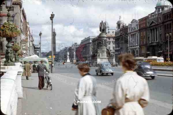 O_qt_Connell Street Dublin, Ireland, 1953, showing vintage cars and Nelson_qt_s pillar and Daniel O_qt_Connell Statue