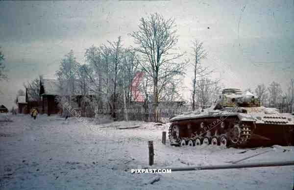Panzer III equipped with the L42 50mm gun and winter white camo. Russian village. 207 Infantry Division. Russia 1942