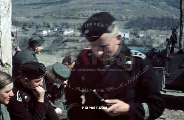 Panzer officer smoking pipe, staff meeting, Don, Rostow, July 1942, 22nd Panzer Division. PKW Horch 901.