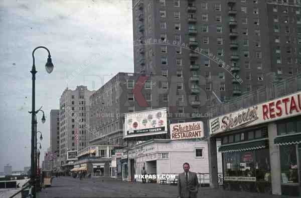 PostW color 1947 New York board walk shop restaurant american flag bank german tourist