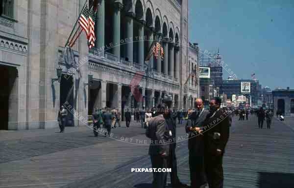 PostW color 1947 New York board walk shops bank american flag german tourists