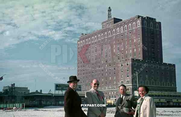 PostW color 1947 New York city factory building german tourists board walk beach