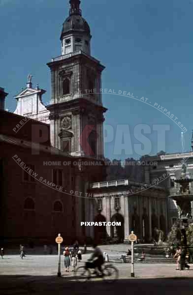 Residenzbrunnen Fountain beside Salzburg Dom Church. Residenzplatz. 1940