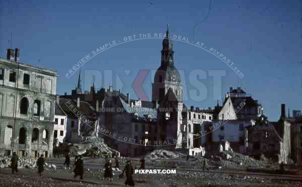 Riga Dom badly destroyed Latvia 1944, market place, burned out shops and houses.