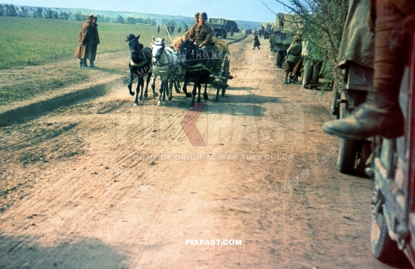 Romanian army retreating from Russian front line. Horse wagon and camouflage trucks flood dirt road. Russia 1944