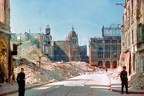 Rue Royale in Orleans France 20.6.1940. La Rotonde. Notre Dame des Miracles Church. German panzer officer.