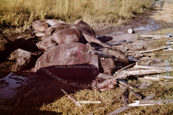 Russian army transport horses struck down by German Stuka attack. Ukraine 1942