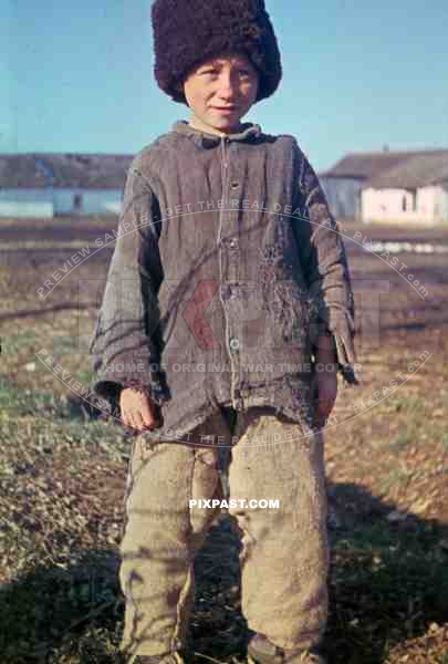 Russian farmer boy in traditional cloths photographed by German war reporter on the Russian Front 1943